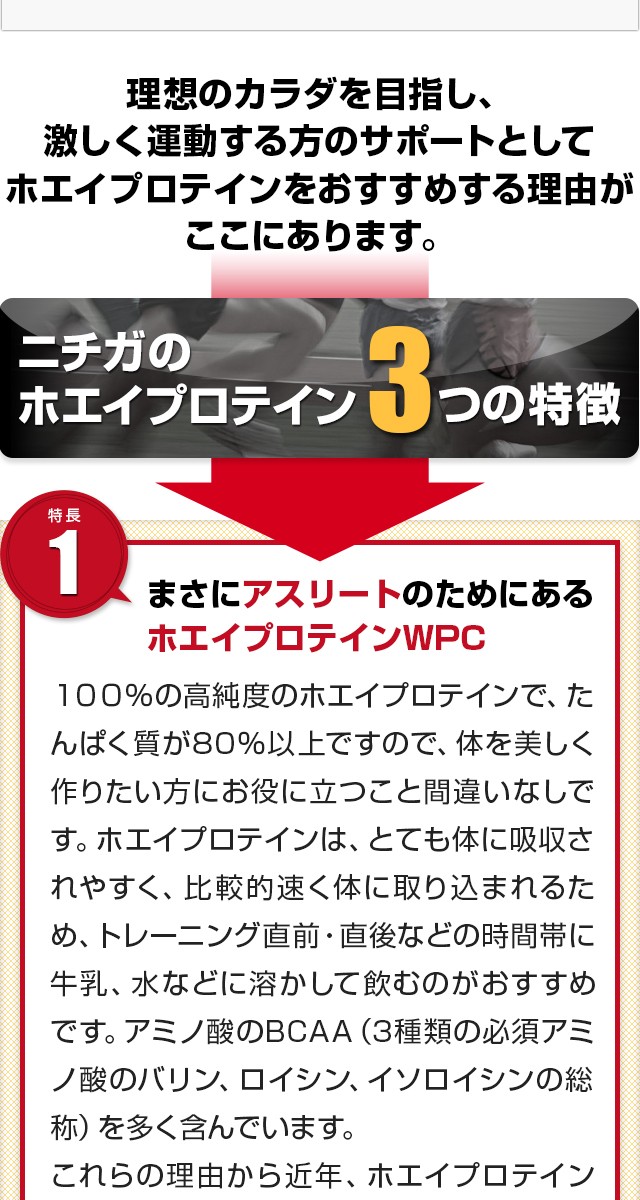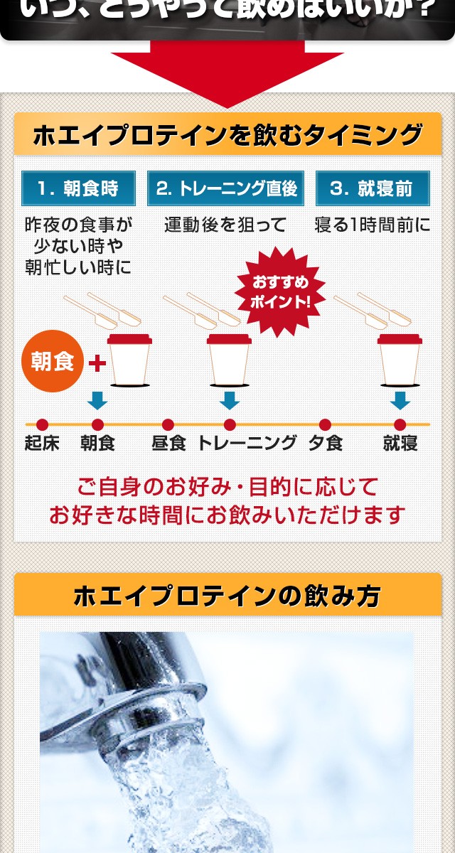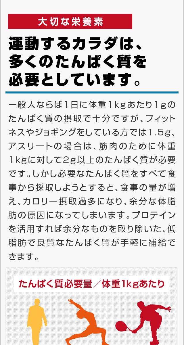 | お召し上がり方 | 1回 約20g ※量は運動量・体重に応じて調整してください。 ・運動していない方 体重あたり1g ・フィットネスをする方 体重あたり1.5g ・スポーツ選手 体重あたり2g |