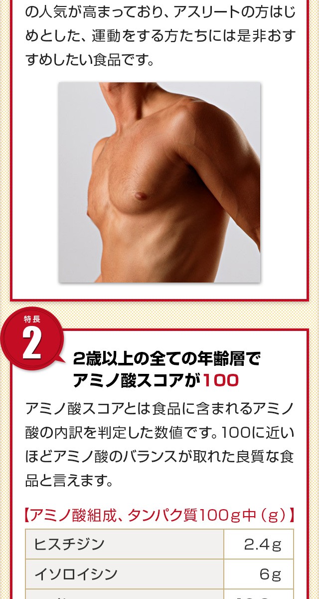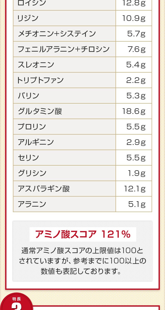 ※アミノ酸スコア 121%(通常アミノ酸スコアの上限値は100とされていますが参考までに100以上の数値も表記しております。)