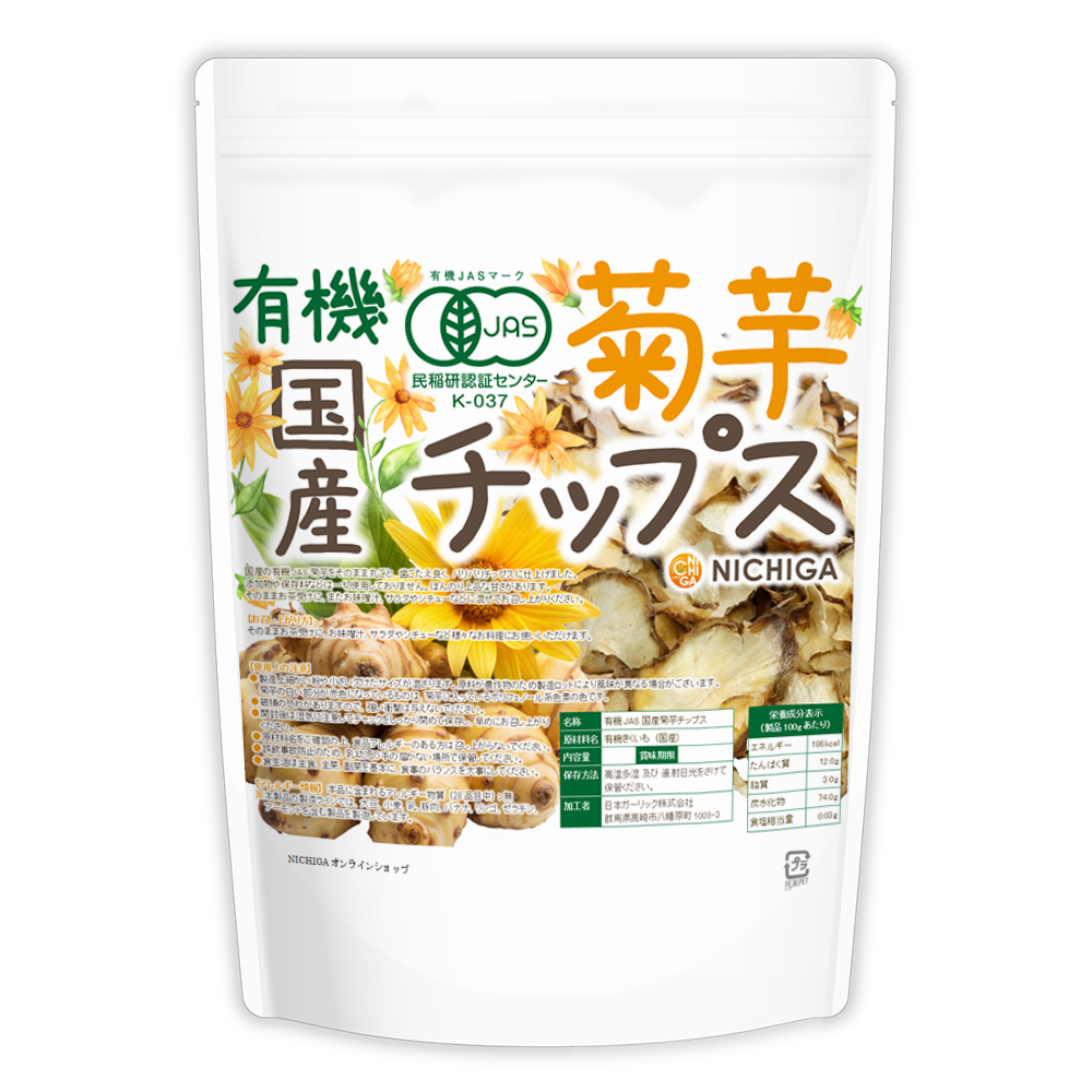 | 有機認証 | 【有機JAS認定】 有機JAS認定農園で収穫された有機菊芋 ⇒ 有機JAS認定の加工場 ⇒有機JAS認定工場(ニチガ)での最終小分け加工を経て商品チェックまで、ようやくお客様にお送りする有機JAS国産菊芋チップスが完成致します。ニチガの工場だけではなく、すべての工程が有機JASなどオーガニック認定を取得しております。 |