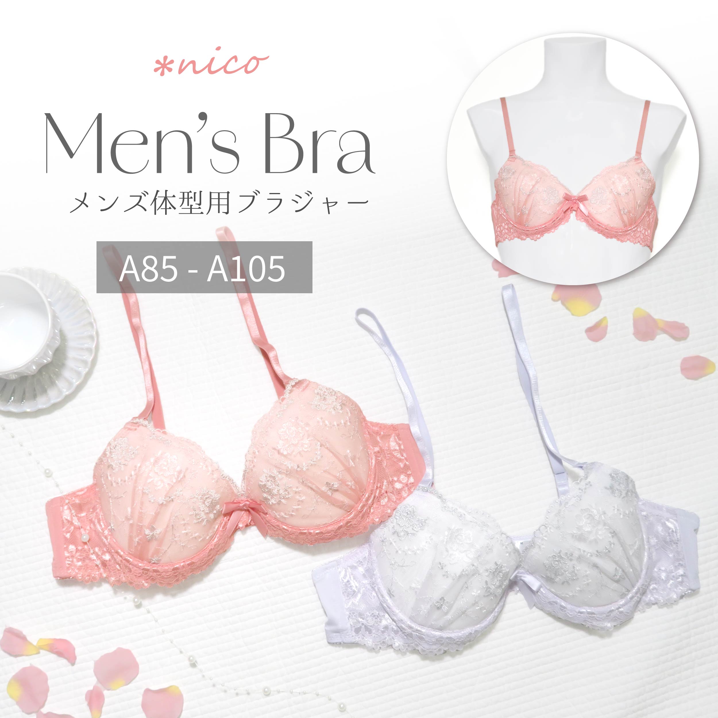 肌を艶やかに引き立てる、深みのある濃色レースを重ねたメンズ用ブラジャーです。
