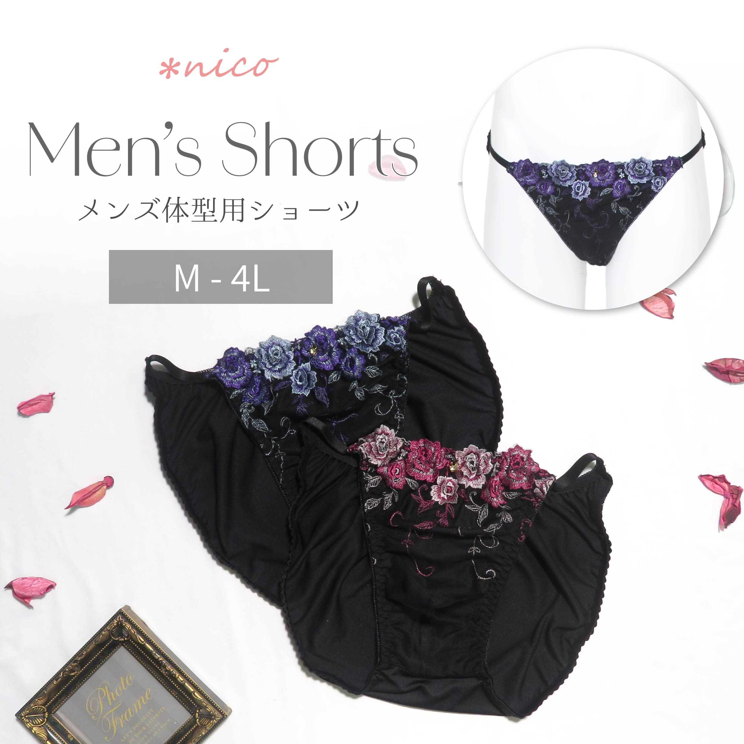 クラシカルなローズ刺繍が上品に咲くメンズ体型用ショーツ。
