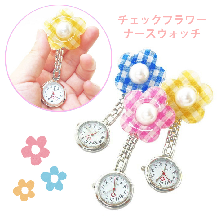 YBB1490 ナース ウォッチ チェック フラワー クリップ 時計 カラフル , 看護師 保育士 花 ウオッチ 可愛い 看護婦 看護士 看護学生 プレゼント 懐中時計 保育園