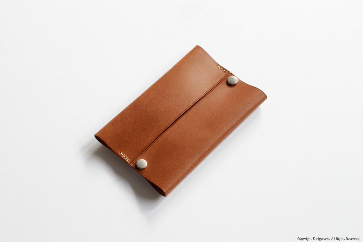 ケースの革には張りがあり、それでいて柔かい。使用されているのは世界でも高級といわれるイタリアのヌメ革ブッテーロ。素材の良さを生かした、ポケットティッシュを革で包むようなデザインは、日本で縫製しています。