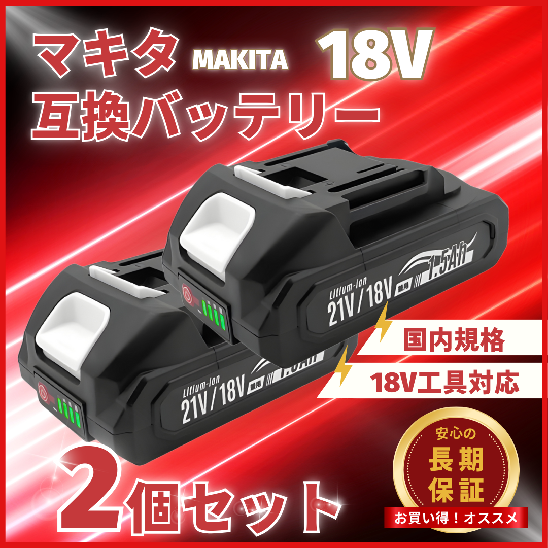 マキタ 互換 バッテリー 18V 21V 兼用 1500mAh 2個セット PSE認証済み 充電式 LED電池残量表示 DIY 園芸 小型 軽量 ※充電器別売り (AB1815B/2個)