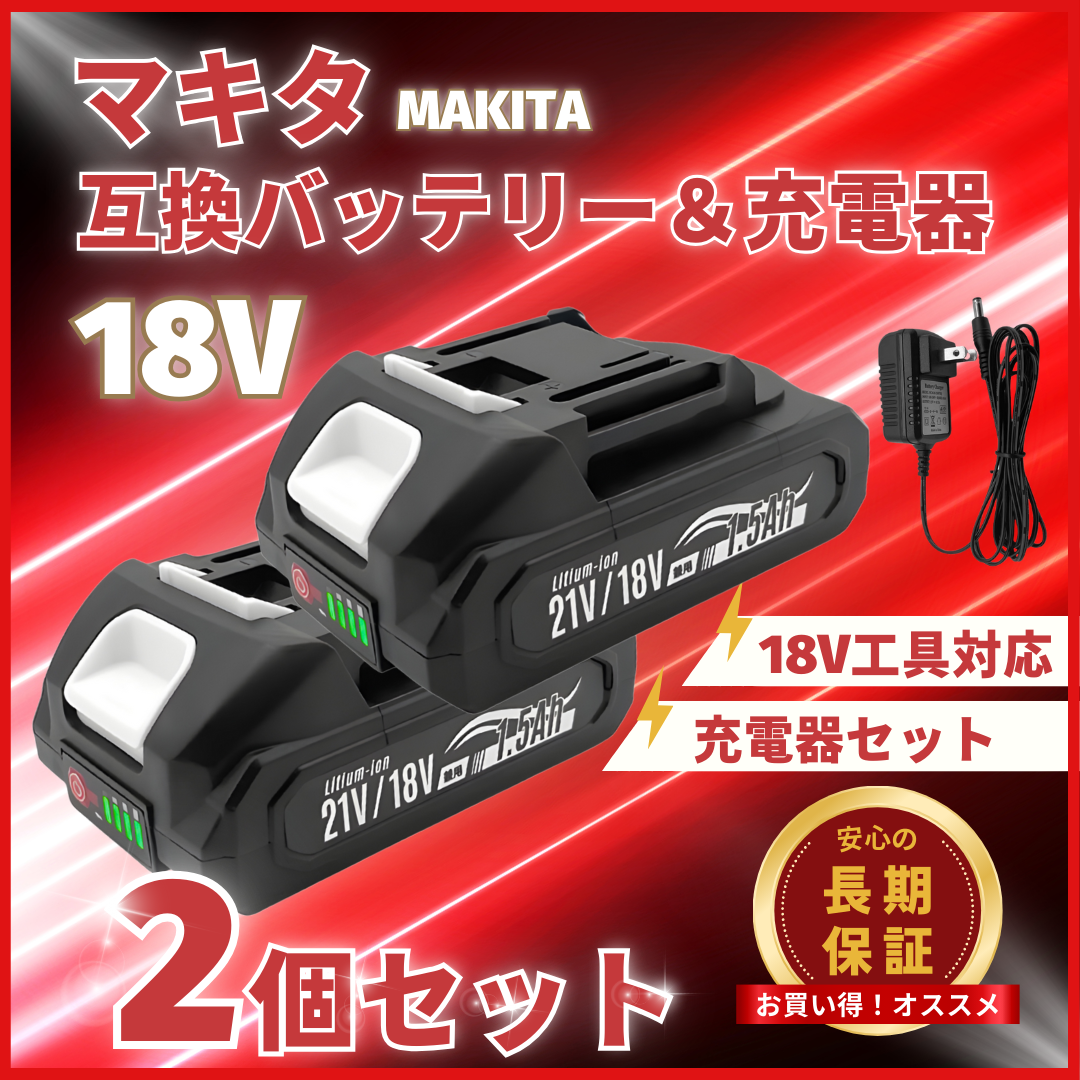 マキタ 互換 バッテリー 18V 21V 兼用 1500mAh 充電器セット PSE認証済み 充電式 LED電池残量表示 DIY 園芸 小型 軽量 (AB1815B-2-HC1610)