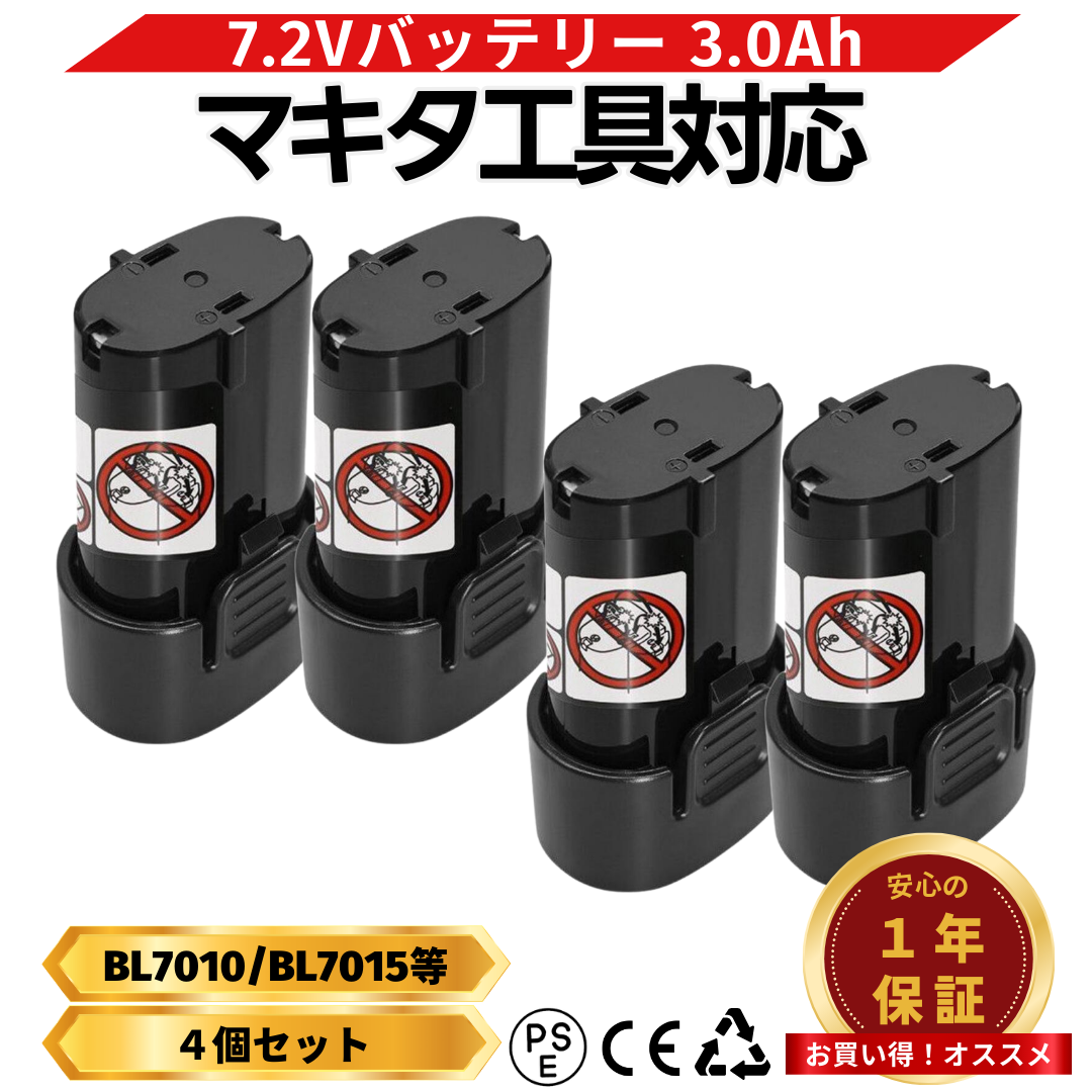 マキタ 互換品 BL7010 バッテリー 7.2V 3.0Ah 4個セット 電動工具 BL7015 A-47494 194356-2 1年保証 PSE認証 CL070DS TD021DS 対応 (BL7010/4個)