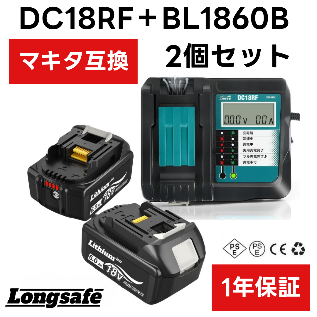 マキタ 互換 18V バッテリー 充電器セット BL1860B DC18RF マキタバッテリー 18V 1年保証 PSE認証 DC18RC DC18RD 対応 日本企業 ( DC18RF×1台+BL1860B×2個 )
