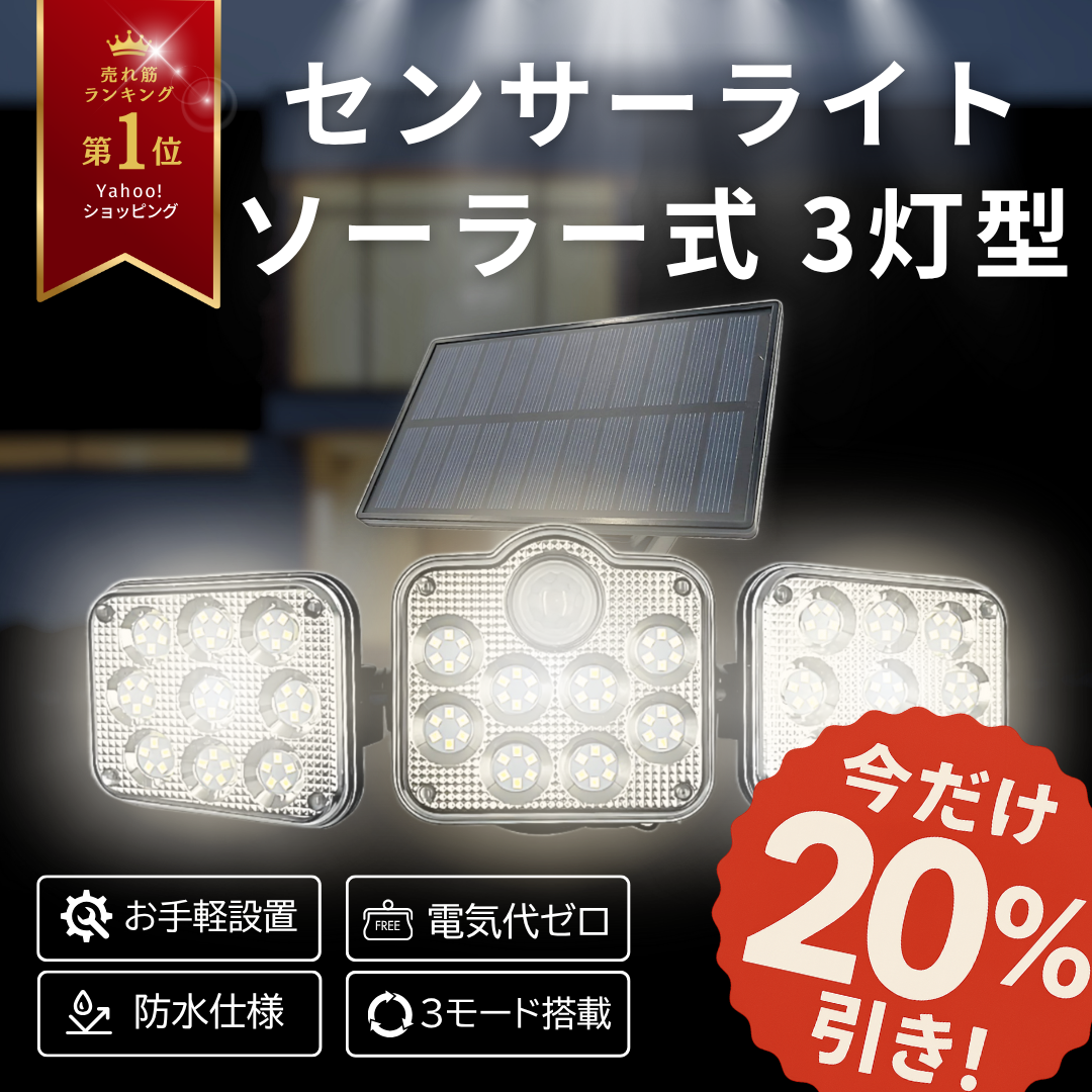 ソーラーセンサーライト 3灯式 屋外 室内 センサーライト ソーラー 式 屋外 人感 防水 分離型 LED 明るい 庭 パネル 玄関 防犯 駐車場 IP65 (SSL01)