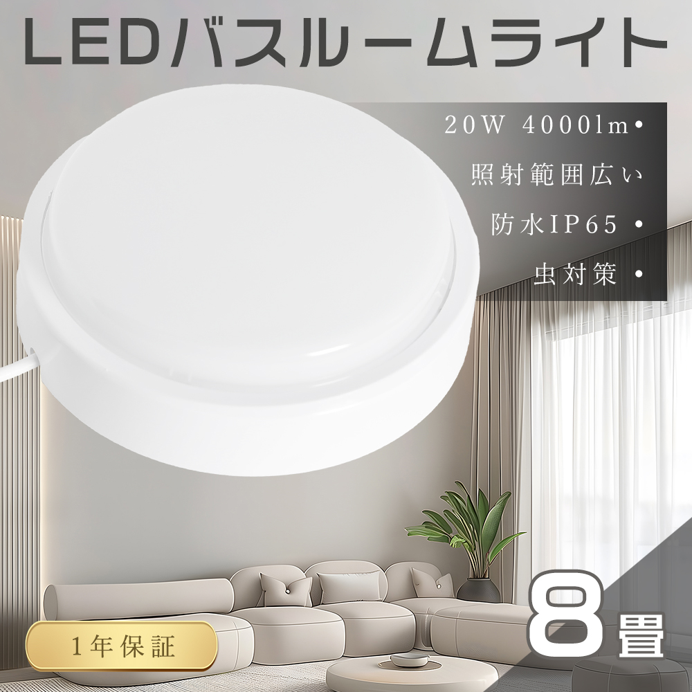 LED バスルームライト IP65防水 20W 8畳 昼光色6000K 浴室ライト ポーチライト 屋外 シーリングライト 防雨 壁掛け 通路 玄関 お風呂 洗面所 廊下 軒下 1年保証