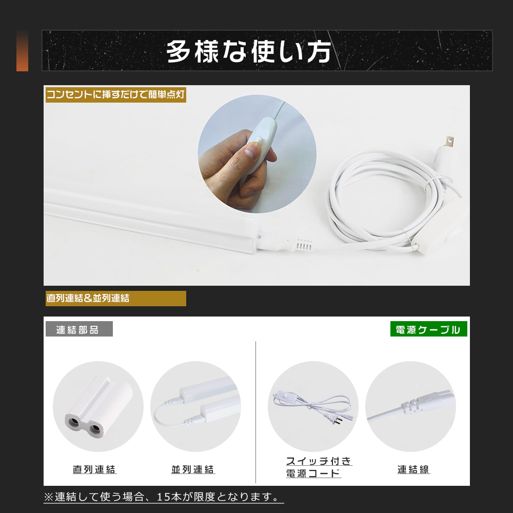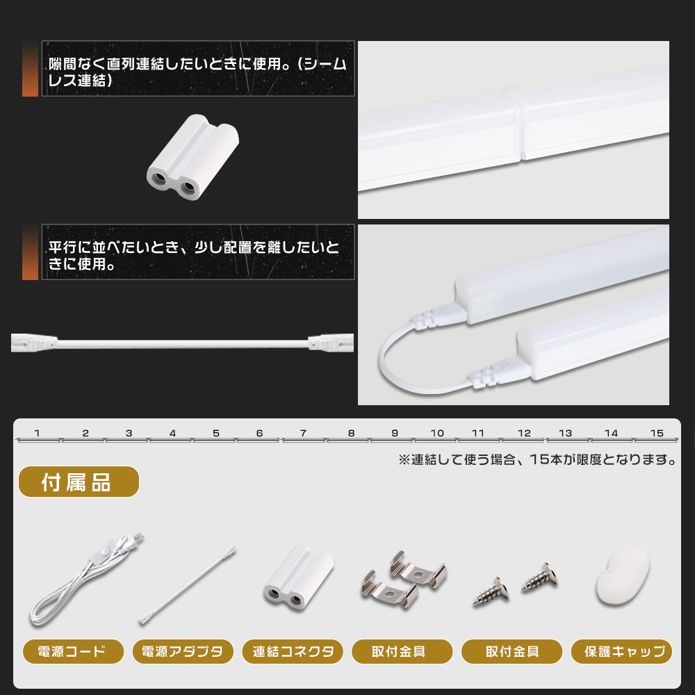 | 15本まで連結可能 | 2ピン連結用パーツと連結コードが付属しており、最大15本まで直列連結が可能です。 |