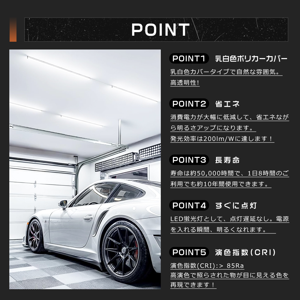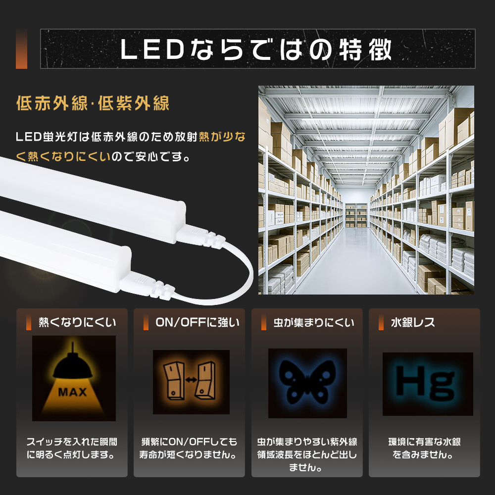| ちらつきなし・点灯遅延無し | 完全フリッカーレス、目に優しい。常時間点しても目が疲れにくいので、オフィスや学校でよく使用されています。 |