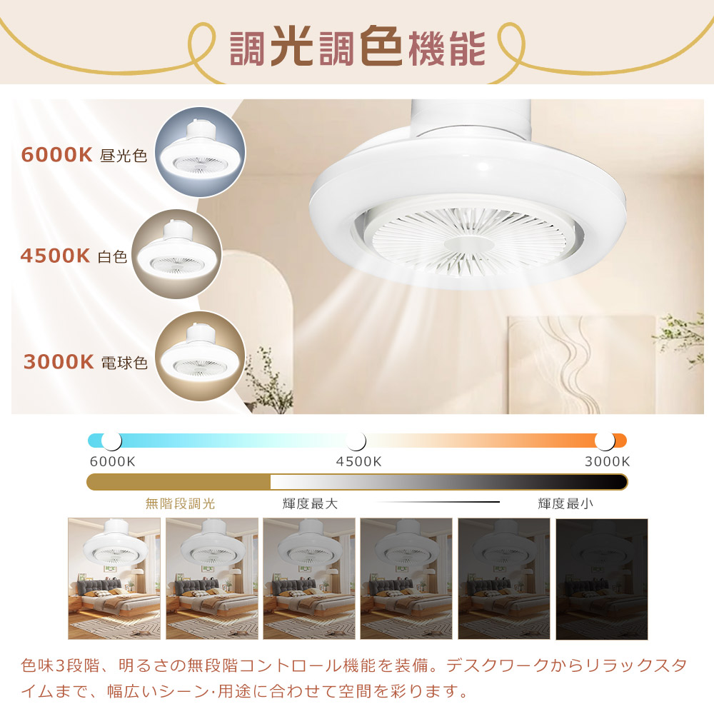 LEDシーリングファンライトはリモコン操作で調光・調色が自在に可能。交換不要のLEDモジュールを搭載し、到着後すぐに使用できます。全光束3400lmの明るさを省エネかつ長寿命で実現。3000K〜6000Kの3色切替と10%〜100%の無段階調光に対応し、自然で目に優しい光を演出します。