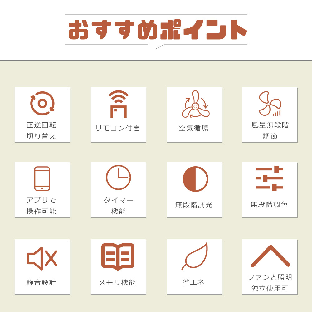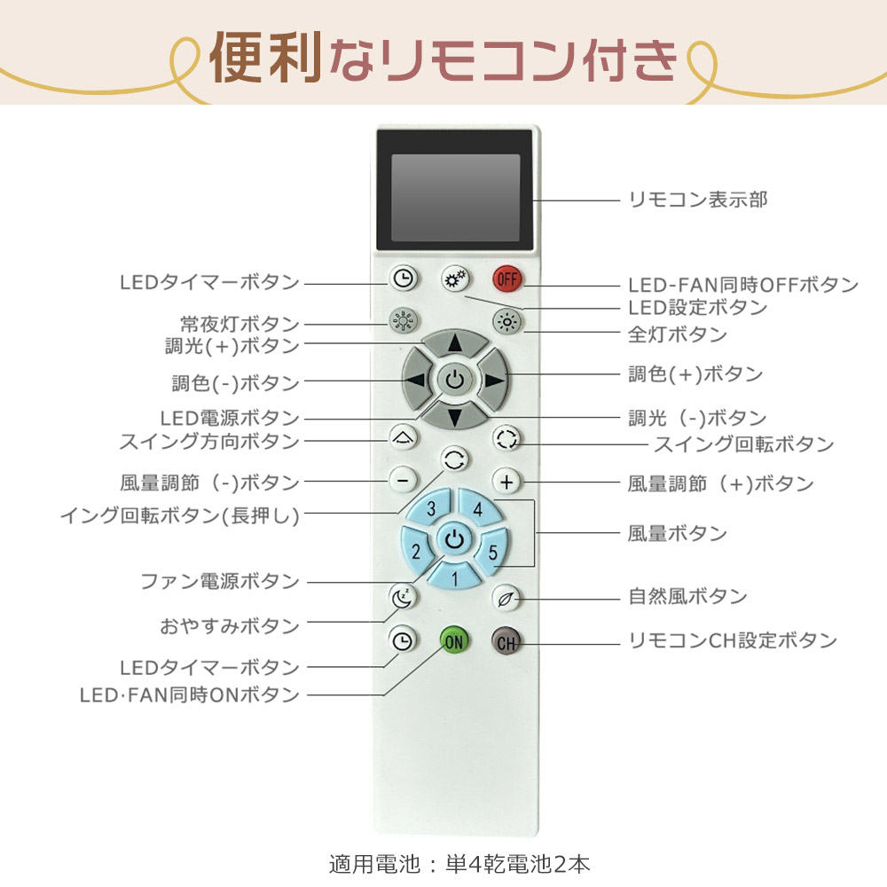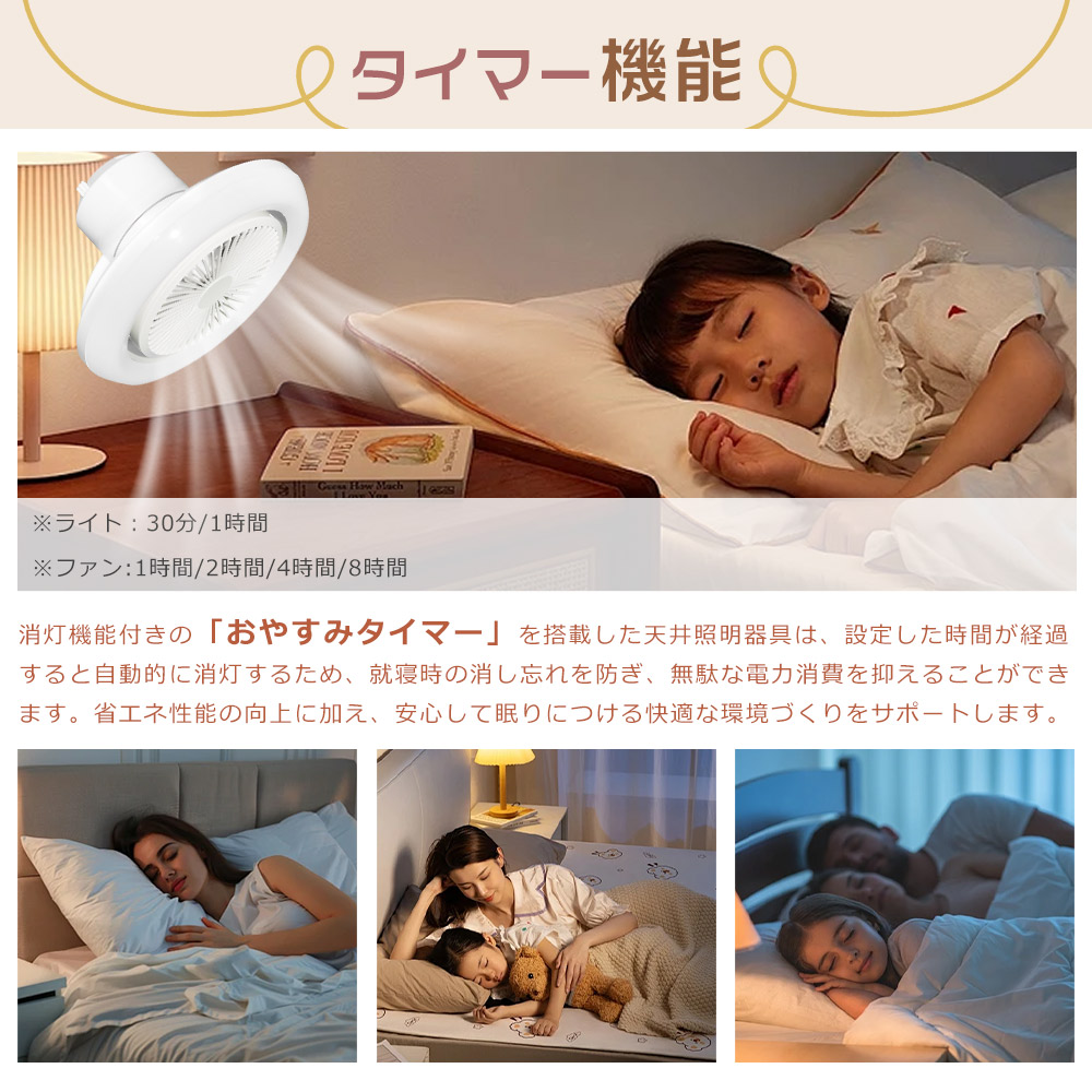 シーリングファンライトは1時間・2時間・3時間などのタイマー設定を備え、省エネかつ消し忘れ防止に役立ちます。メモリー機能により、直前の設定状態を自動復元。リモコン操作で明るさ・色調・風量・タイマーを遠隔調整可能で、暗所での使用にも適しています。さらに低消費電力の常夜灯モードを搭載し、子供部屋や夜間の授乳にも最適です。