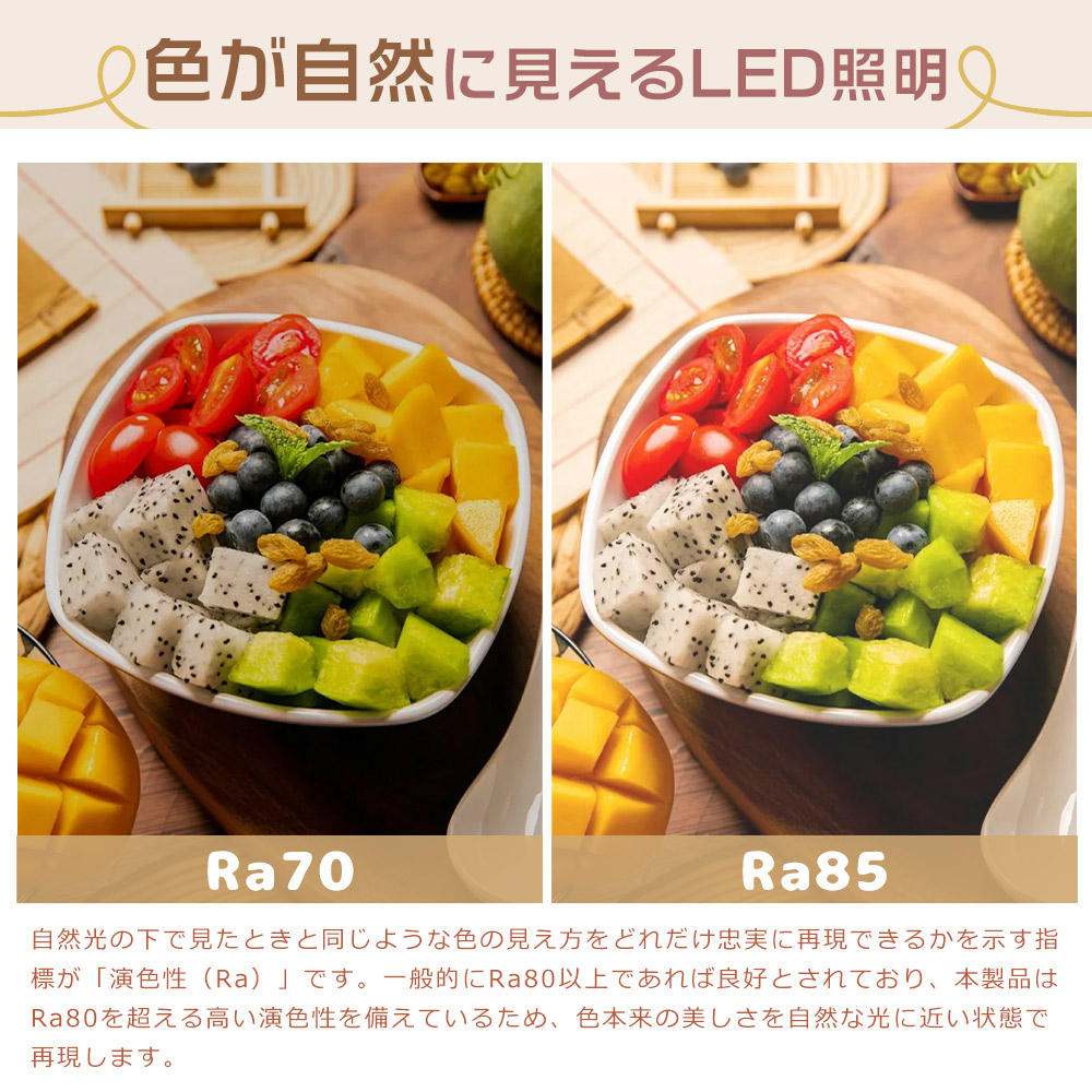 自然光に近い色温度と高演色性により、物の色彩や人の肌の質感を忠実に再現し、美しく鮮明に映し出します。これにより、室内空間に自然で心地よい雰囲気を演出するとともに、見た目の美しさと快適な視環境を両立します。
