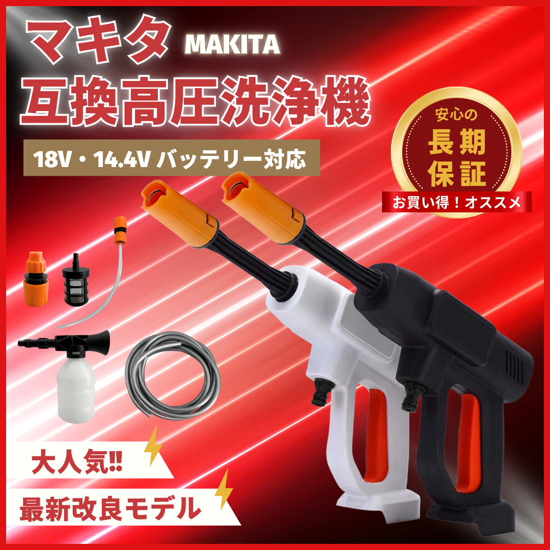 マキタ 互換品 充電式 高圧洗浄機 洗車 ホース フォームガン シャンプー タンク式 洗車機 洗浄機 コードレス 電動 18V 14.4V makita バッテリー 対応 (WAS03)