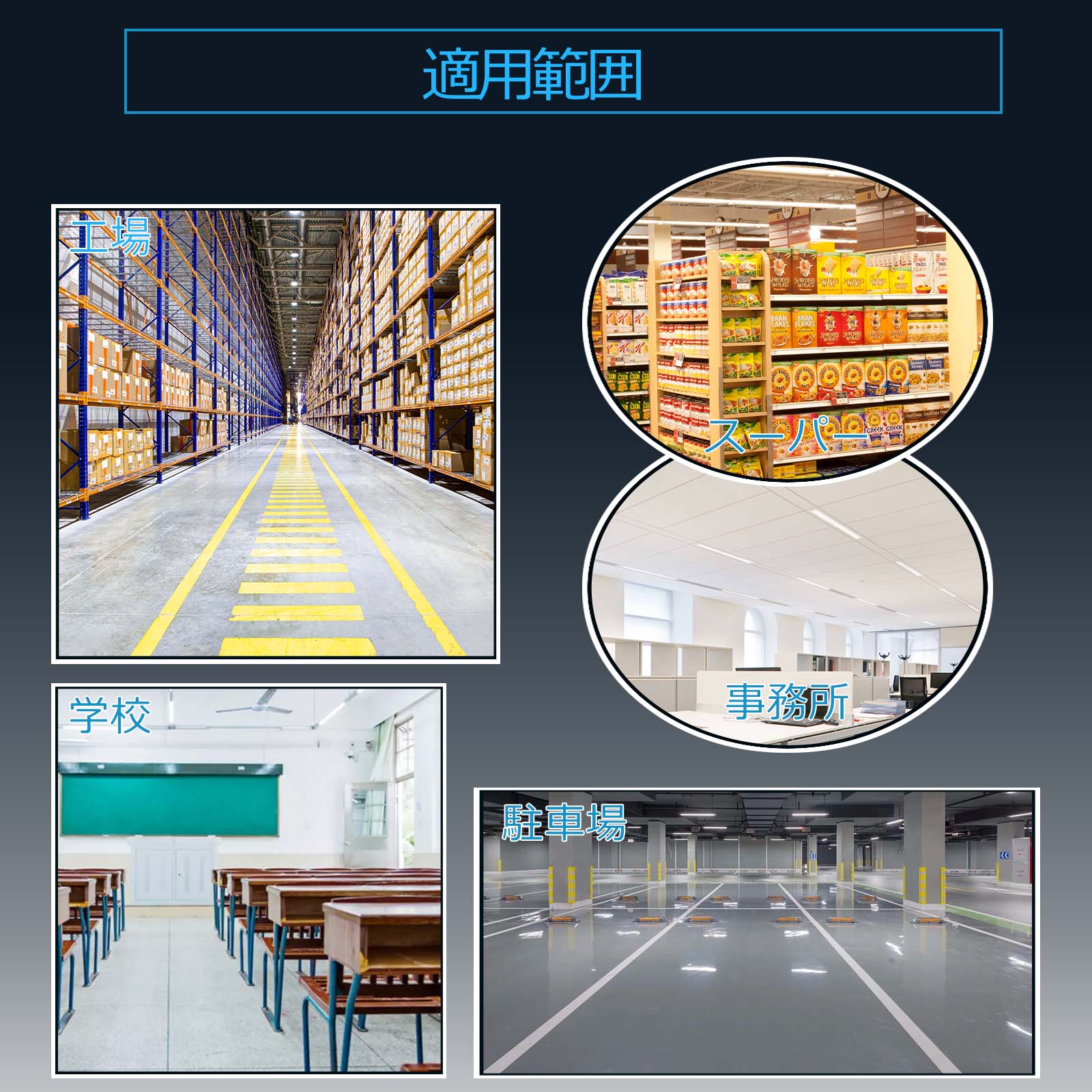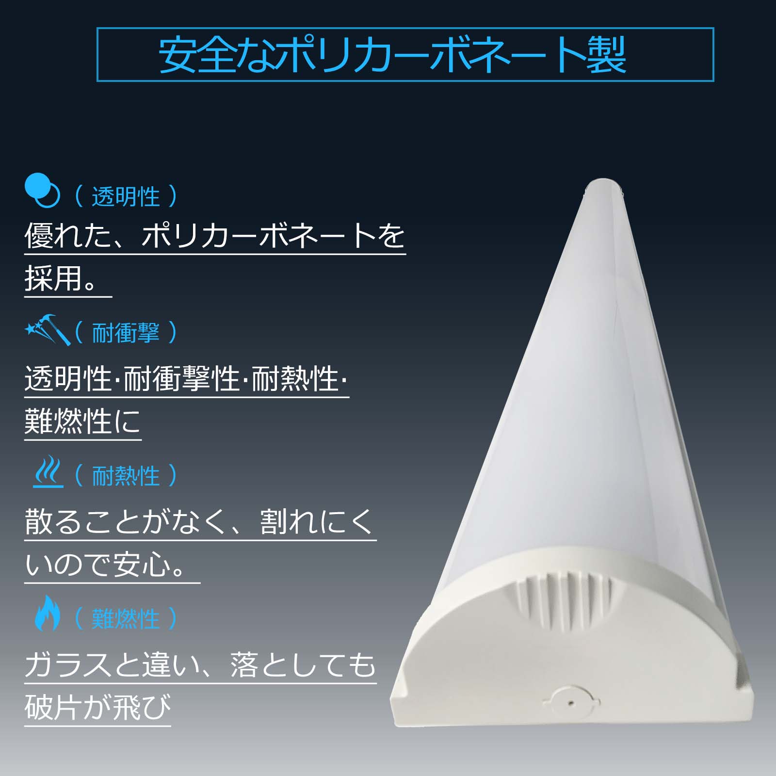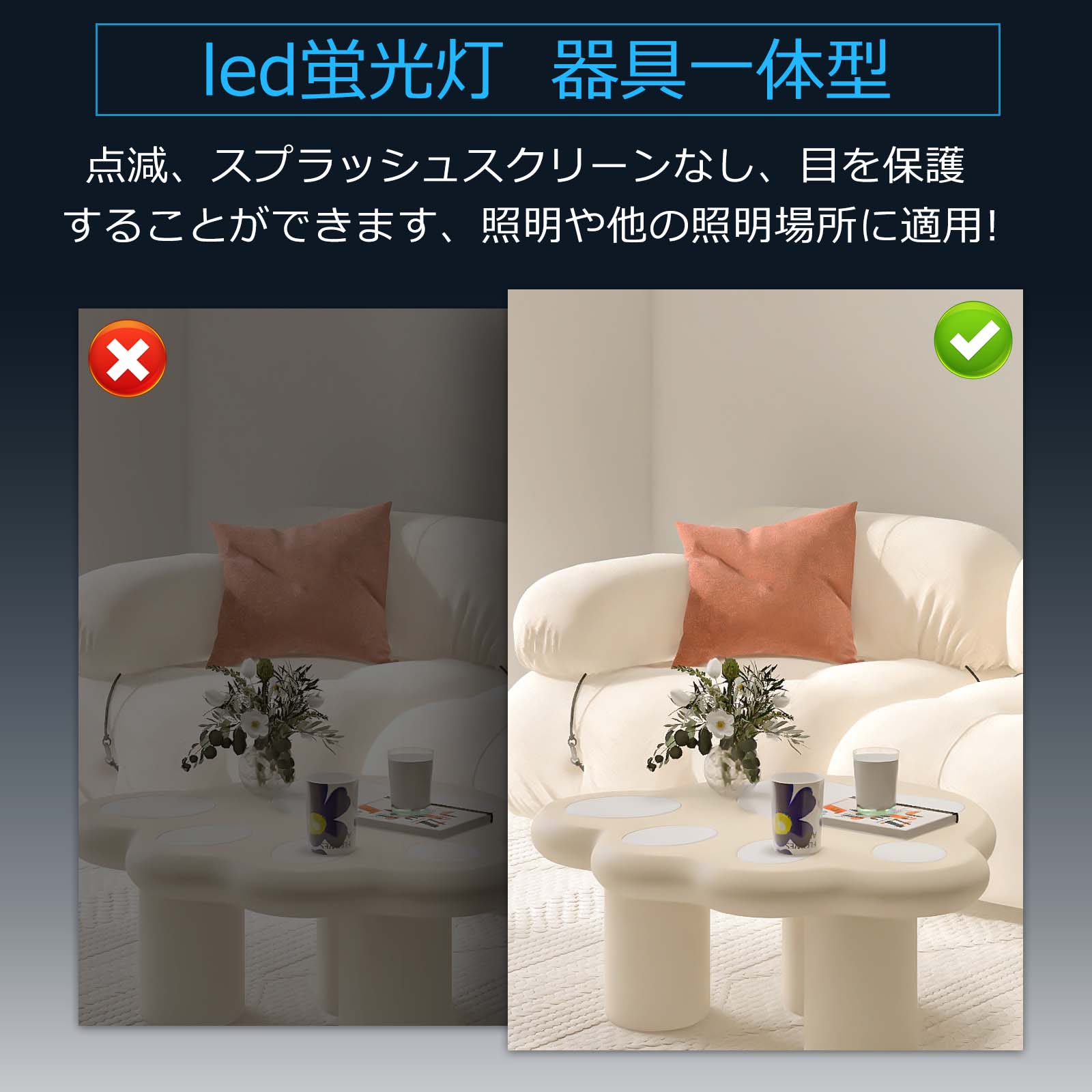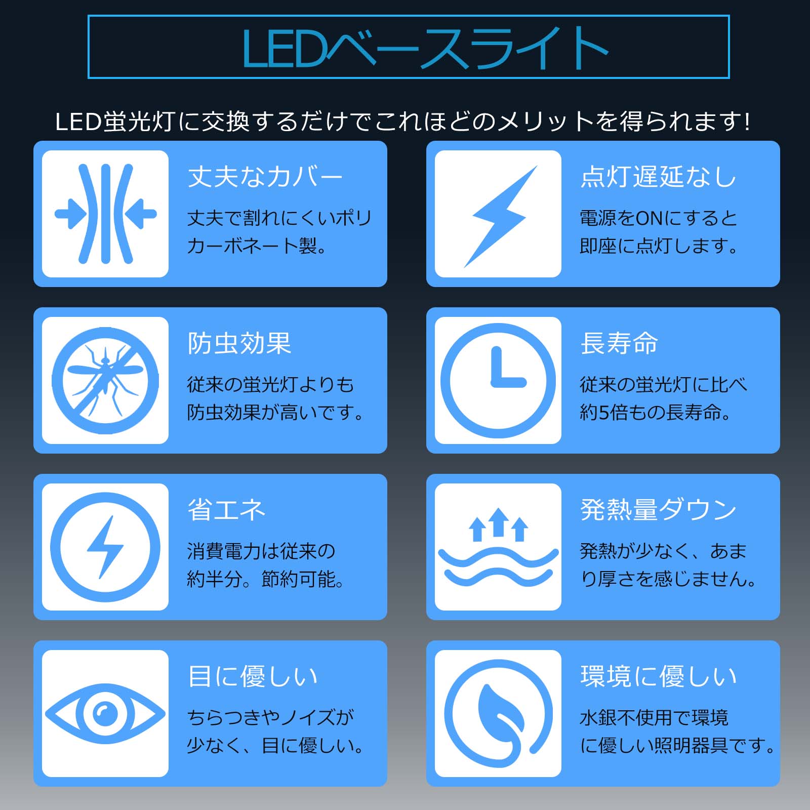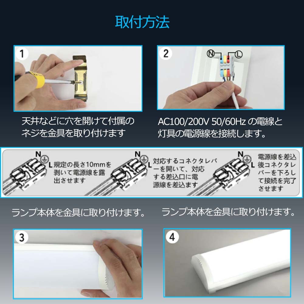 取り付けが簡単。ちらつきを抑える 虫が寄りつきにく国際ノイズ規格のCISPR15に準拠。病院・オフィス・学校・公共場所・展示場・製薬会社・食品工場・営業所・工場の完璧な選択肢。