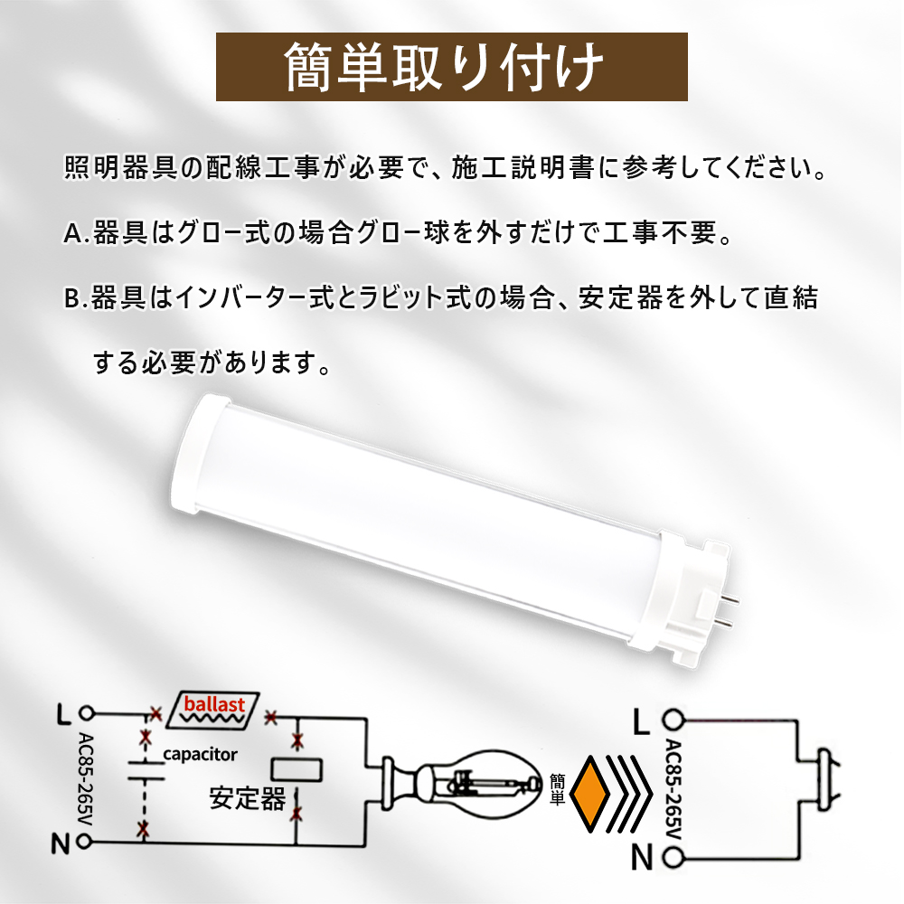 ●※使用上の注意 グロー用安定器使用の器具に直接取り付ける場合は必ずグロー管を取外して下さい。
