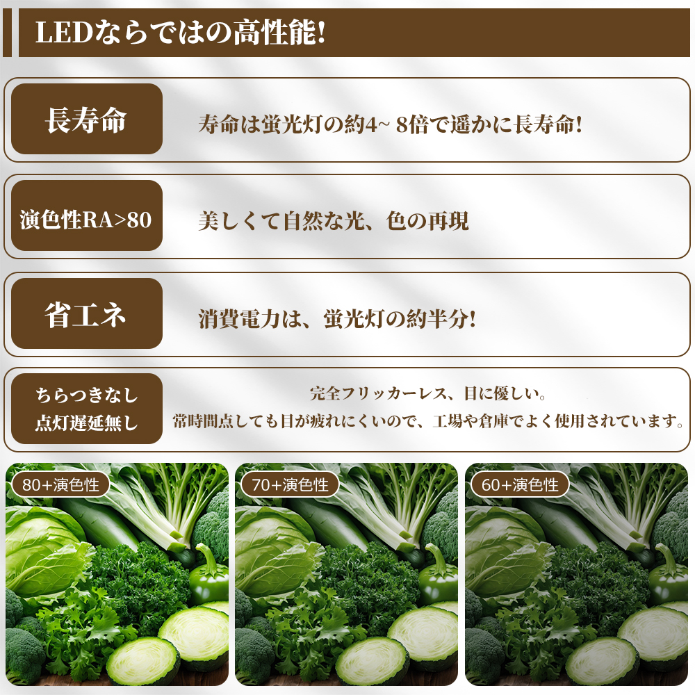 日本製高品質素子採用高効率 高輝度 低損失 低熱を実現可能 。日本LEDチップを採用して、業界高水準となる発光効率200lm/Wを実現。過酷な作業環境に耐える頑丈な照明器具。