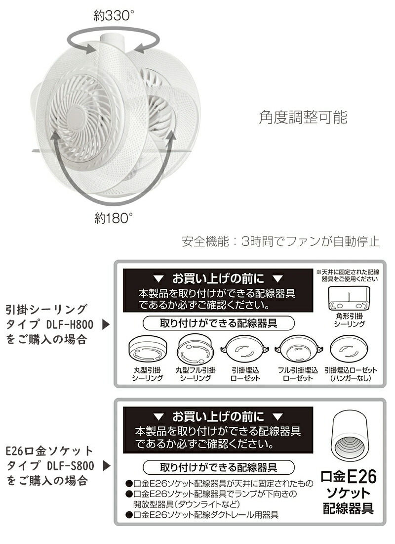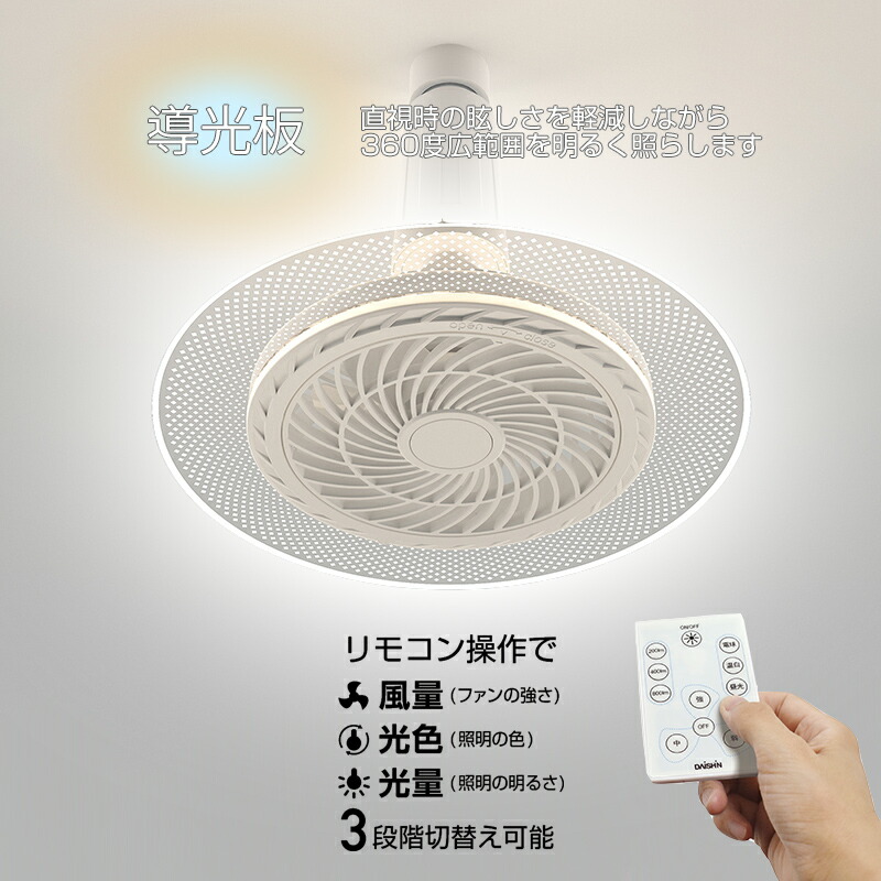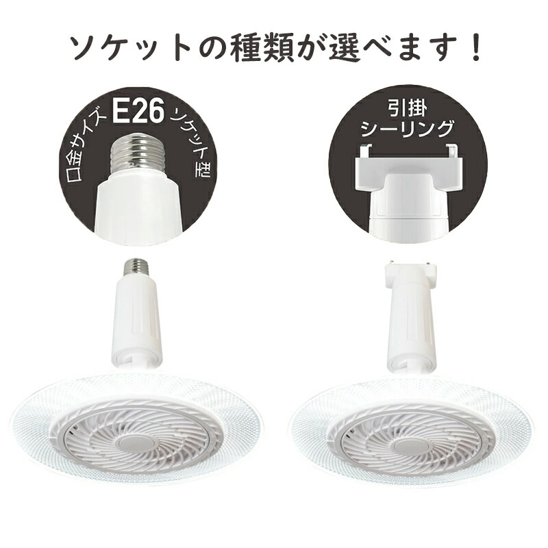 | ファン付きLEDライト ソケットタイプ 心地よい風と優しいあかり 照明と扇風機が一台になったファン付きLEDライト。 様々なシーンで空間を明るく照らし、快適な風を送ります。 リモコン操作で風量・光色・光量を3段階切替え可能 導光板で直視時の眩しさを軽減しながら、360度広範囲を明るく照らします。 サイズ(約):220 x 220 x 200mm 重量(約):390g 電源:AC100V 電圧:50/60Hz 消費電力 LED:約12W(最大光量時) ファン:約6W(最大風量時) 器具光束(最大):800lm 推奨使用周囲温度:約5〜35℃ 付属品:リモコン(動作確認用電池CR2025装着済)、取扱説明書 お買い上げの前に 本製品を取付できる配線器具であるか必ずご確認ください。 取り付けできる配線家具 ・口金E26ソケット配線器具が天井に固定されたもの ・口金E26ソケット配線器具でランプが下向きの開放型器具(ダウンライトなど) ・口金E26ソケット配線ダクトレール用器具 取り付けできる配線家具【引掛シーリングタイプ】 ・角型引掛シーリング ・丸形引掛シーリング ・丸形フル引掛シーリング ・引掛埋込ローゼット ・フル引掛埋込ローゼット ・引掛埋込ローゼット(ハンガー無し) |