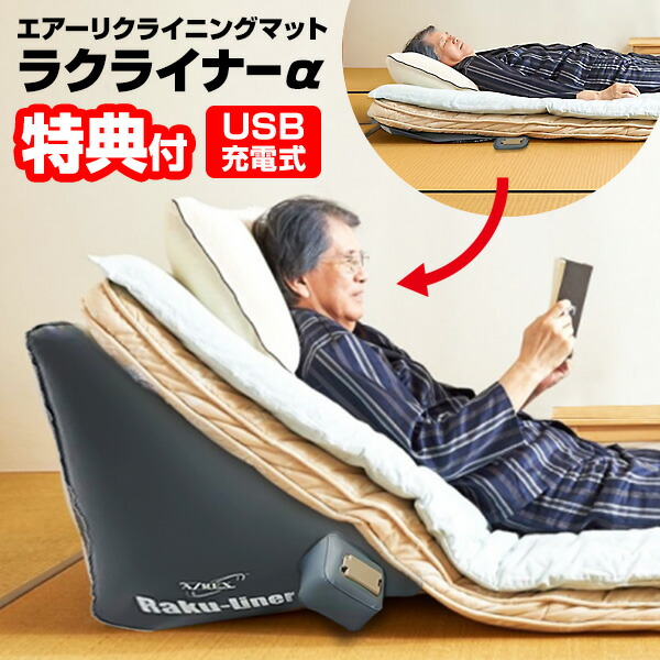 | 毎朝の布団の起き上がりに苦労していませんか? ●電動ベッドは高価だし、置く場所もない ●介護をしていて体起こしが大変 ●使っている布団やベッドにリクライニング機能が欲しい そんな方にオススメ! エアーリクライニングマット ラクライナーα ラクライナーをお使いの布団の下に敷くだけで、電動ベッドの様に上半身の昇降が可能! エアーポンプがエアーバッグを膨らますことで自然に布団を持ち上げていきます。 ちょっと起き上がる時、テレビを見たいとき、本を読みたち時など布団がリクライニングすることで快適にできるようになります。 また、ベッドにもご使用いただけます。 ※ベッドで使用する場合は敷布団かマットレスを敷いてご使用ください。 ※枠が金属のマットレスにはご使用いただけません。 商品サイズ 約幅100x奥行120×高さ60(空気注入時)(cm) 商品重量 約2kg 電源 USB充電式 DC5V/1A 使用電池 リチウムイオン充電池 1300mAh 充電時間 約4時間 連続使用時間 約10分 空気注入時間 約60秒 耐荷重 約60kg 素材 ポンプユニット:ABS樹脂 エアー枕部:PVC セット内容 ポンプユニット、エアー枕部、ズレ防止シート、取扱説明書(保証書付) ※折り曲げることができない硬質のマットレスは使用できません。 ※USB-ACアダプターは付いておりません。 本製品の電池は「取り外し不可の充電式電池」であり、電気用品安全法におけるPSE対象電池(取り外し可能な電池パック等)には該当しません。 そのためPSEマークの表示は不要な仕様となっております。 |