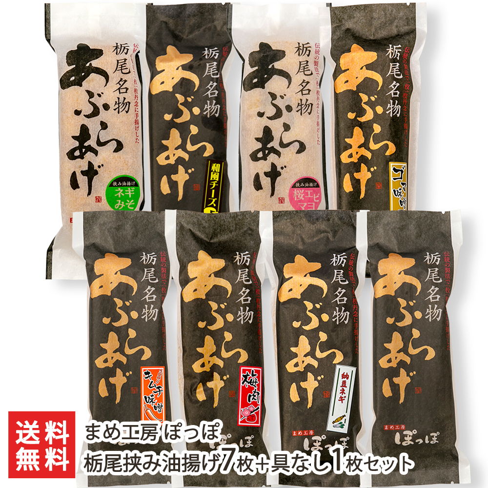 | 内容 | 栃尾挟み油揚げ7枚+具なし1枚セット 商品内容:ネギ味噌・和風チーズ・桜エビマヨ・ゴマ味噌・キムチ味噌・梅肉・納豆ネギ・具なし |