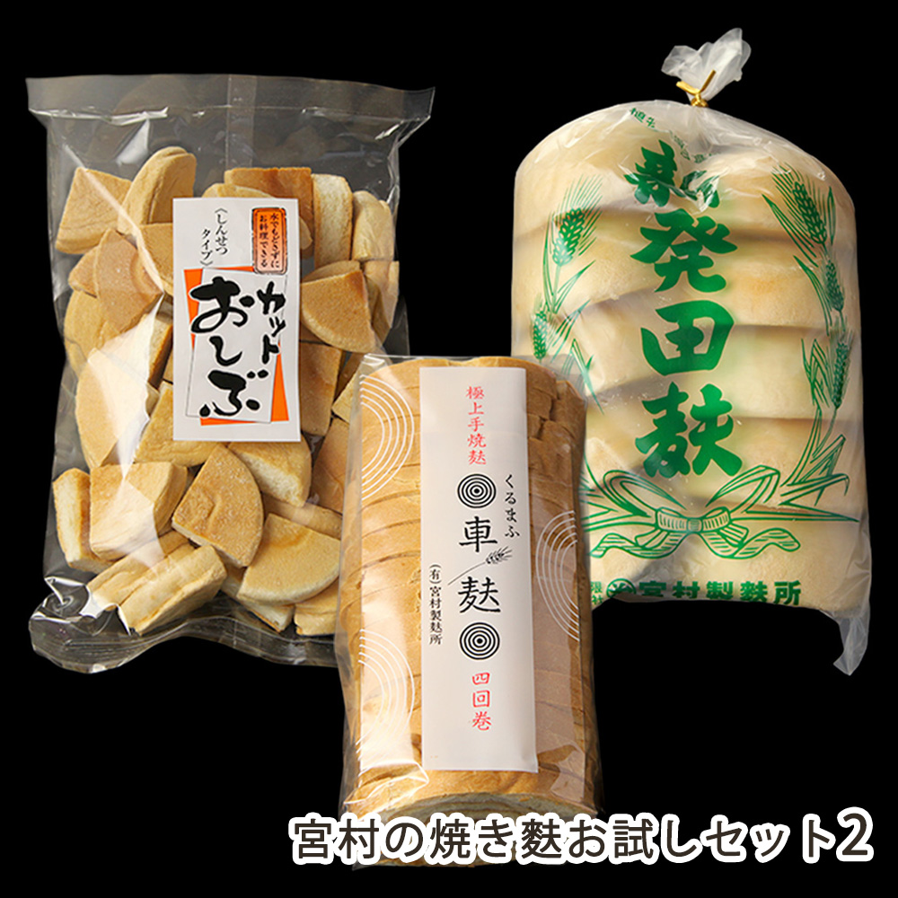 宮村の焼き麩お試しセット2(カットおしぶ100g、車麩4回巻15枚入り、新発田麩10個×1袋)有限会社 宮村製麸所/送料無料