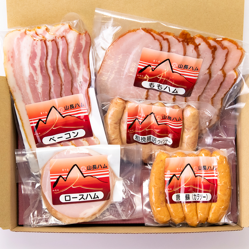 | 内容量 | 粗挽腸詰ウインナー:1袋あたり120g 粗挽腸詰フランク:1袋あたり80g、1袋あたり160g 唐蘇(カラソー):1袋あたり100g ロースハムスライス:1袋あたり75g ロースハムブロック:1袋あたり650g ももハム:1袋あたり145g ベーコンスライス:1袋あたり70g ベーコンブロック:1袋あたり250g ポークローフ:1袋あたり240g |