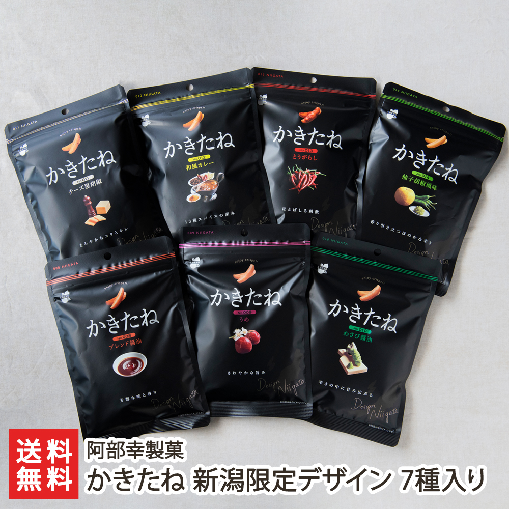 | 内容 | かきたね 新潟限定デザイン 7種入(ブレンド醤油, うめ, わさび醤油, チーズ黒胡椒, 和風カレー, とうがらし, 柚子胡椒風味) |