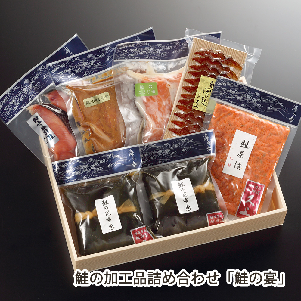 | 内容 | 鮭の加工品詰め合わせ「鮭の宴」 商品内容:塩引鮭の切身(大パック)1袋, 鮭の味噌漬1袋, 鮭のこうじ漬1袋, 鮭の酒びたし1袋, 鮭茶漬1袋, 鮭の昆布巻2袋 |