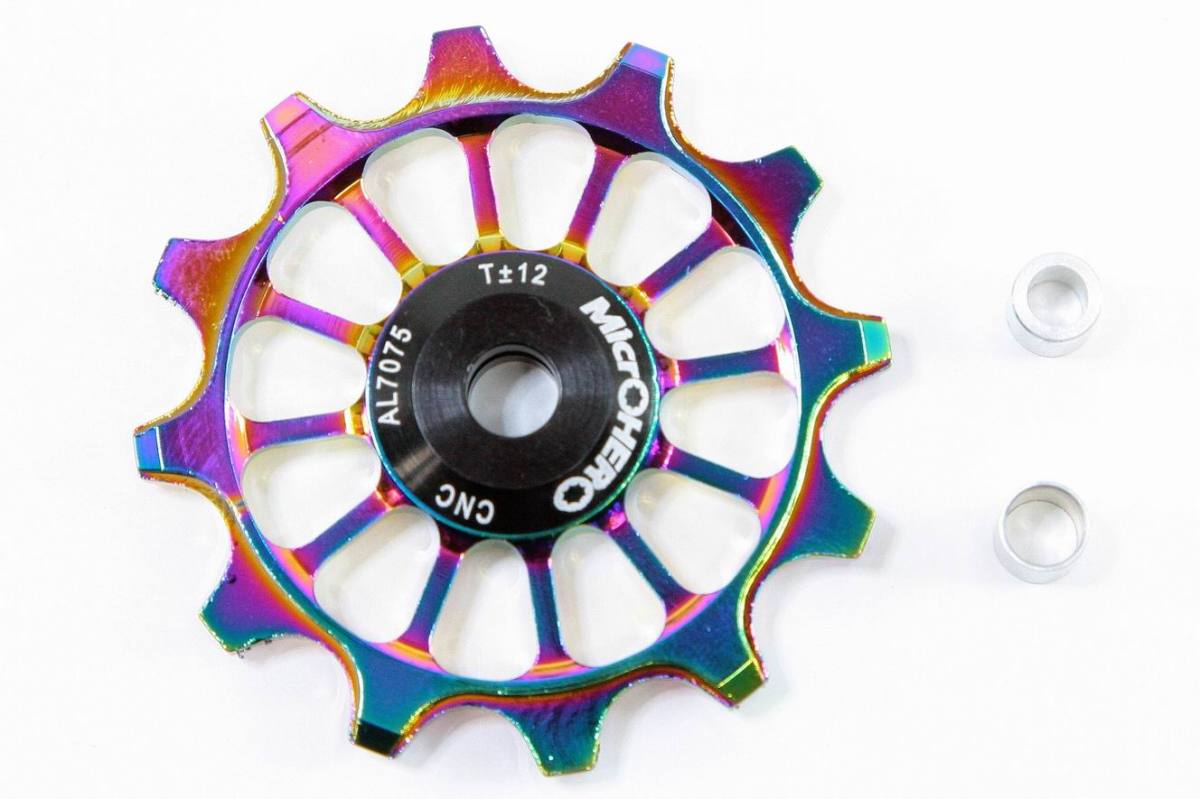 【即納】MicrOHERO 超回る セラミックベアリング ナローワイド アルミ プーリー 12T 虹色 チェーン脱落防止、ブレ防止に