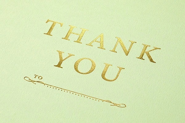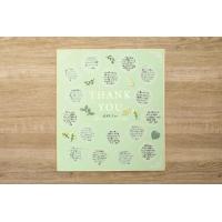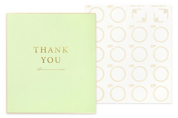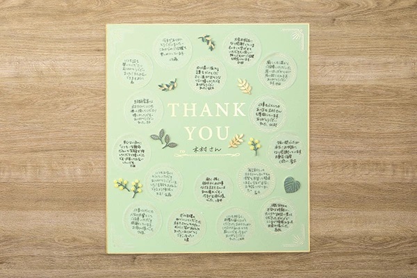 中央に金箔で「THANK YOU」の文字をクラシックなフォントでデザイン。色紙の色は、目上の方にも使えるような優しい印象の明るいグリーンを選びました。