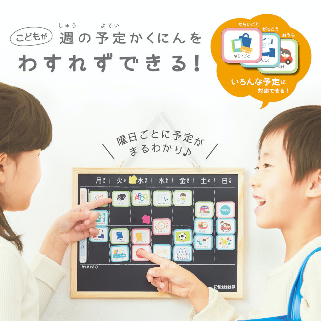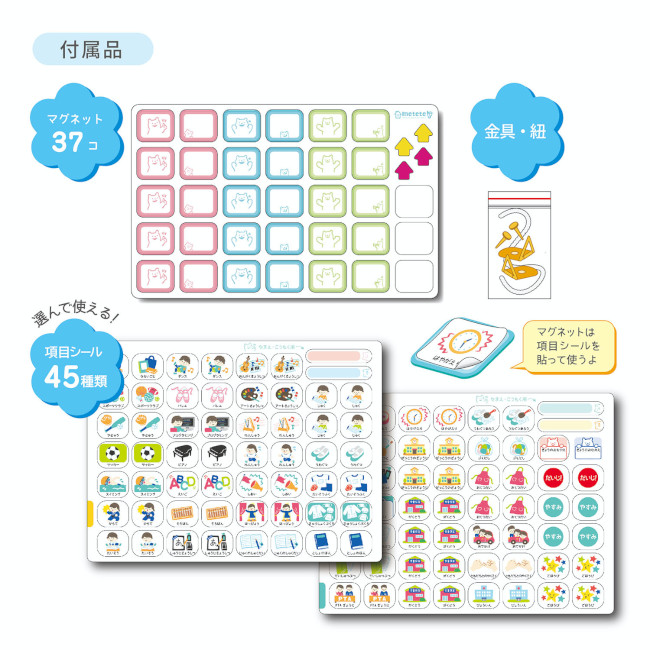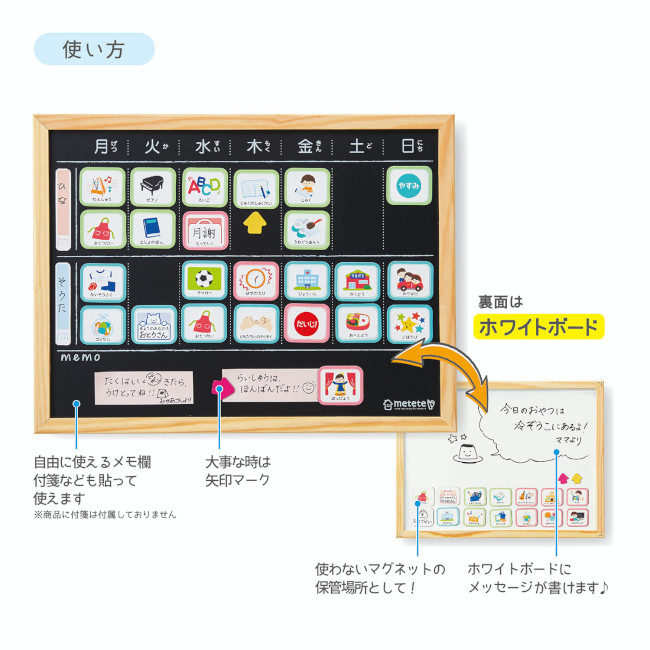 ボードのリバーシビル仕様、四角マグネット33個つき、矢印マグネット4個つき、項目シール2シート(45種類)つき
