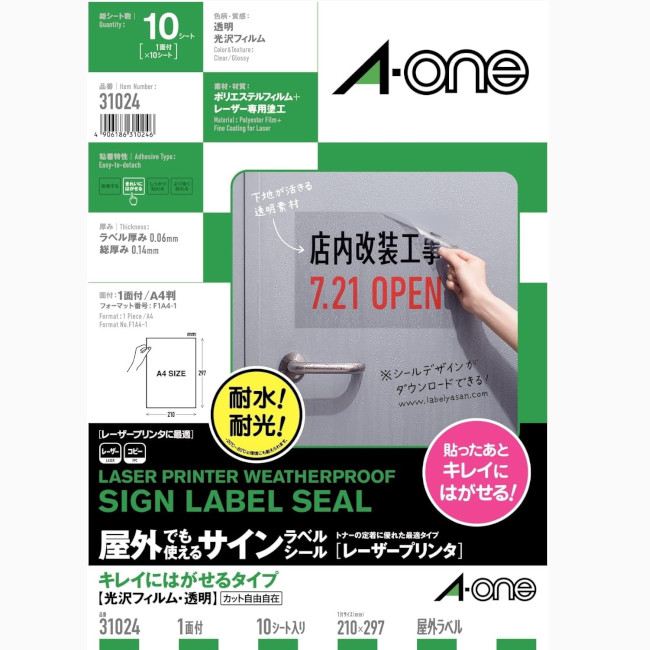 エーワン 屋外でも使えるサインラベルシール 光沢フィルム 透明 A4 1面 ノーカット キレイにはがせるタイプ