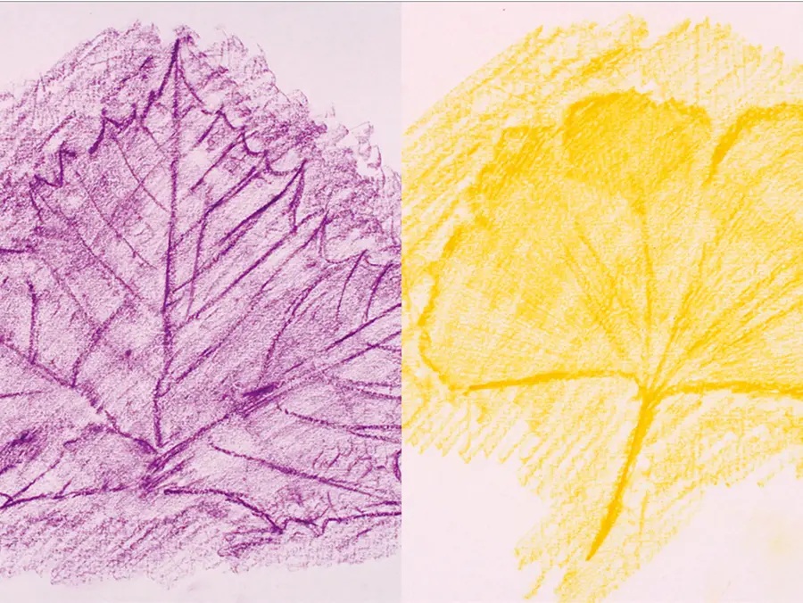 葉っぱ等の上に紙を乗せ、その上からくれよんやパスで軽くこすると凹凸の模様が写し取れます。