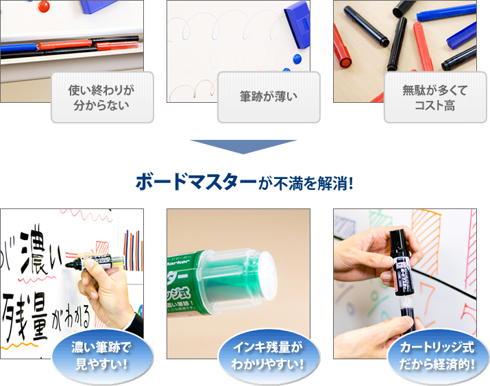 濃くハッキリ書ける。経済的なホワイトボードマーカーです。