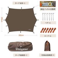 撥水加工とUVカット:Unigear キャンプ タープの素材はPU加工処理済で、耐水圧が3000mmとなり、大雨に強い。また、縫い目にはシームテープが貼られており、雨漏り防止;裏側には紫外線をカットするシルバーコーティングをが施され、暑い季節でも快適に過ごせます。