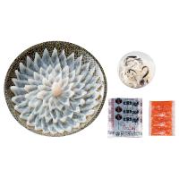 とらふぐ刺身(約80g)・とらふぐ皮(約30g)×各1、ふくポン酢(約10g)・もみじおろし(約10g)×各3 ■賞味期限:製造日より冷凍保存で約90日 ■アレルゲン:小麦