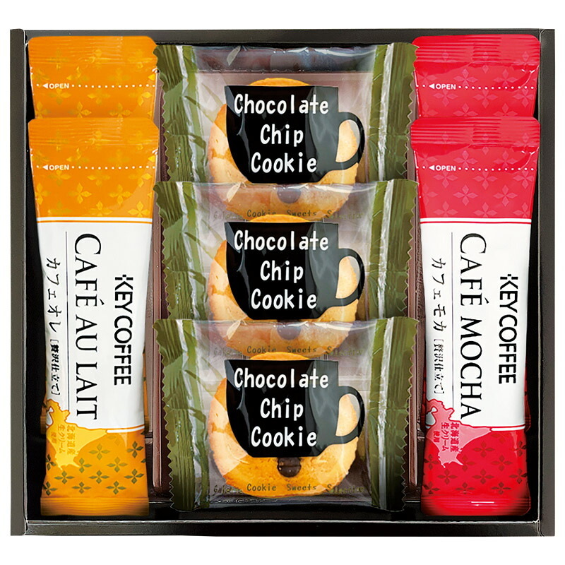 チョコチップクッキー×3、キーコーヒーカフェオレスティック(約7g)・キーコーヒーカフェモカスティック(約7.8g)×各2