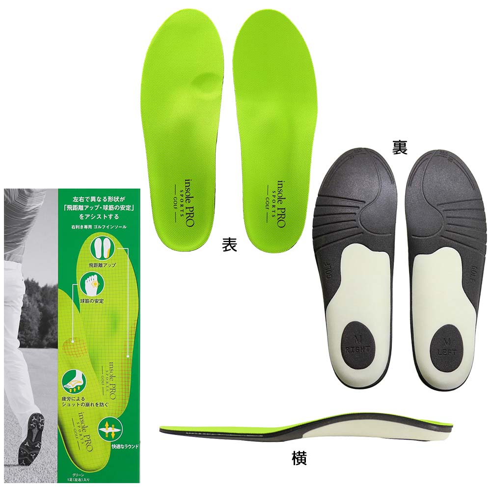 左右で異なる形状が「飛距離アップ・球筋の安定」をアシストする 右利き専用 ゴルフ インソール。【特徴】■「飛距離アップ」右足かかと部外側の傾斜がバックスイング時に起こりやすいスウェー(体重が横方向に流れる)を抑えパワーの溜めをつくる。■「球筋の安定」左足母指球部の「くぼみ」で回転軸を意識することにより、左足の動きが安定させて、フォームをぶれにくくする。■「疲労によるショットの崩れを防ぐ」足裏の3つのアーチをソフトにサポートし、クッション性を高める構造が、足や膝・腰への負荷を軽減させる。■「快適なラウンド」吸水・拡散・速乾・抗菌防臭に優れた素材が、ゴルフシューズ内を快適に保ちます。