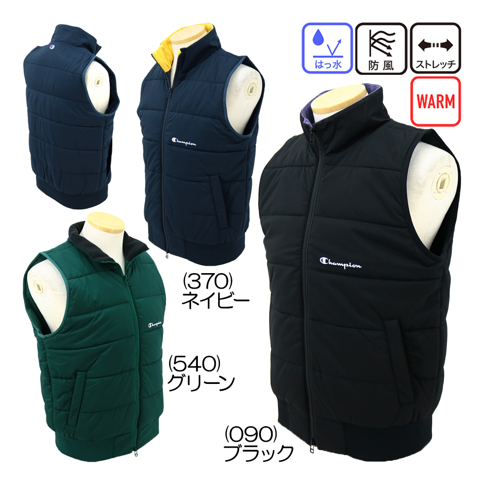 光沢感とストレッチ性が特長のオリジナルタフタ素材を使用した、中綿入りのジップベストです。軽量で、保温性に優れ、防風機能も備えています。表地に撥水加工を行っているので、ちょっとした雨天の際にも着用できます。襟裏にボディカラーと異なる色を使ったフリースを付けることで保温性をさらに向上。身体にフィットするリブ仕様の裾は、ドローコードを絞ることで風の侵入を防ぎます。使いやすいダブルジップ仕様は、下のジップを開閉することで通気性の調節やかがんだ時のたわみの軽減などが可能。両サイドにポケット付き。胸にChampion(R)(チャンピオン)ロゴをラバープリントで入れたシンプルなデザインです。機能性:防風、撥水・防水、ストレッチ、保温。特徴:Rubber Print、Slash Pocket、Double Slider Zipper。中国製。