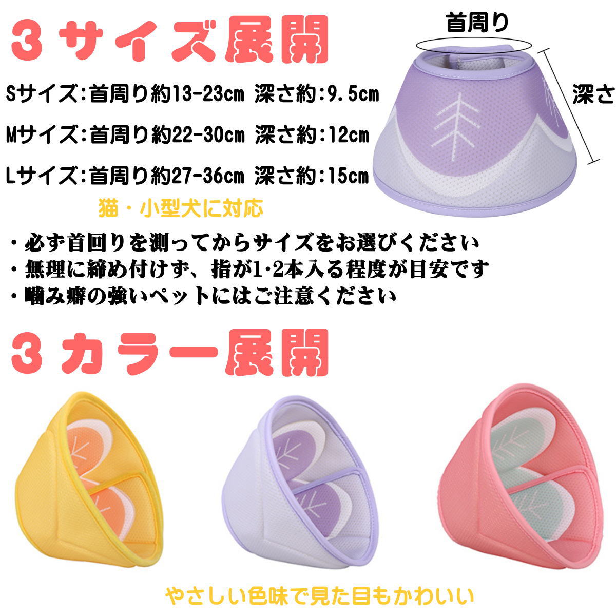 | 【サイズの測り方】 ・ペットの首の付け根部分を測ります ・指が1〜2本入る程度の余裕を持たせてください ・毛量が多い場合は少し余裕を持つのがおすすめ 【注意事項】 ・サイズが合わない場合、十分な効果が得られないことがあります ・噛み癖の強いペットには破損の恐れがあります ・異常が見られた場合は使用を中止してください ・長時間使用の際は定期的に様子を確認してください |