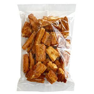 生地を二度揚げし独特の食感に仕上げ、 しょうゆで味付けした後さらにはちみつ味のタレで二度付けしたおかきです。 甘辛味。