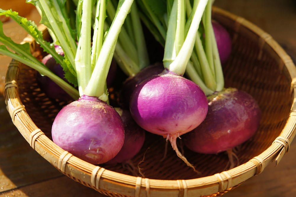 浅漬けや甘酢漬けにすると薄紫色に染まり、とても美味しいかぶ。