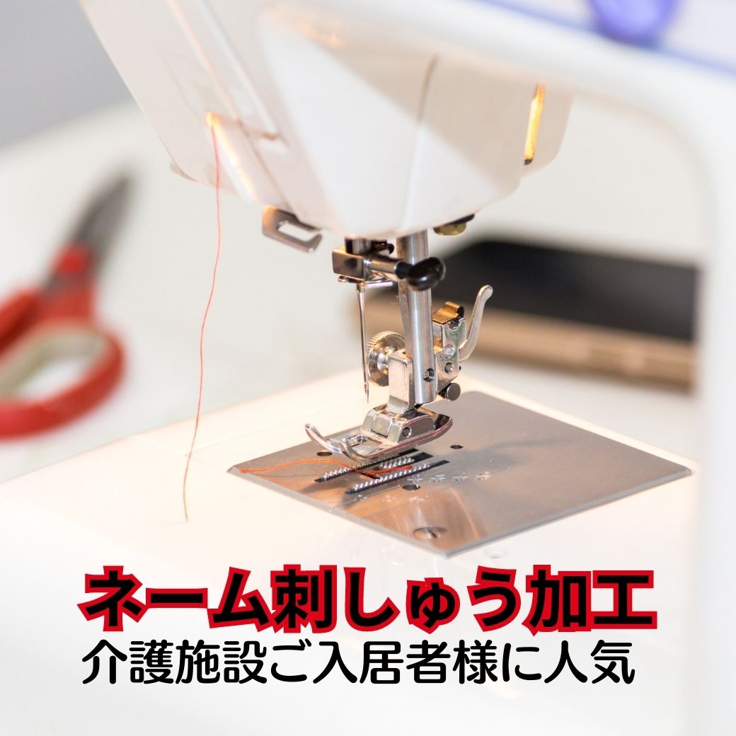 | お名前を刺しゅうして縫い付け致します。 ご自分でお名前を書くことが出来ない。 施設の職員の方への負担軽減になります。 遠方のご家族の方も安心してご依頼ください。 |