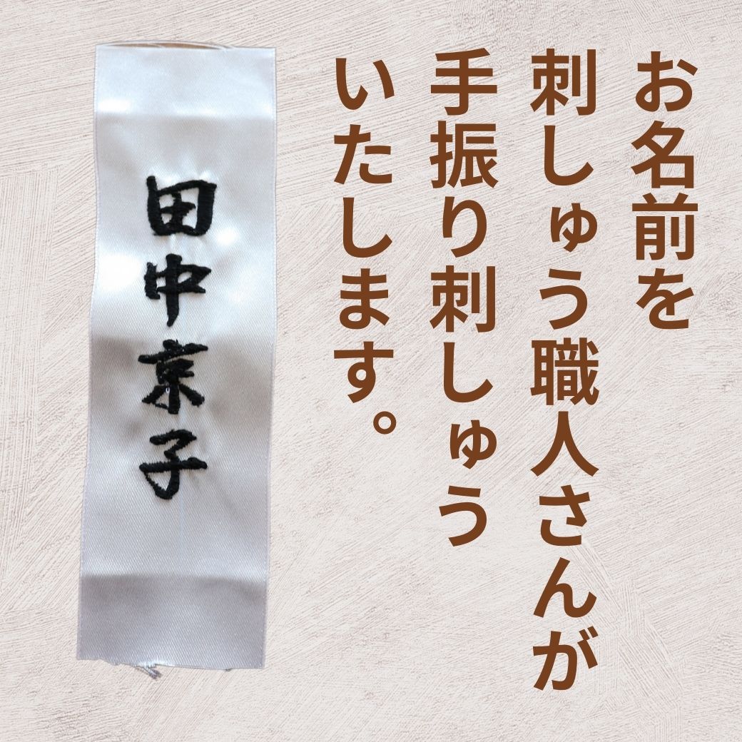 | お買い上げ頂いた商品にお名前を刺しゅうしたラベルを縫い付け致します。 柔らかいサテン生地なので、肌に当たってもチクチクしません。 洗濯しても乾燥機にかけても色落ちせず安心です。 ※刺しゅうの糸色は選べません。当店で最適なものをお選び致します。(黒またはネイビー) ※文字の大きさは選べません。(当店で最適なバランスの読みやすい書体にてお入れさせて頂きます。読みやすい明朝体でネーム入れ致します。) ※ネームラベルを取り付けた商品の交換、返品はお受け出来ませんのでご了承下さい。 |