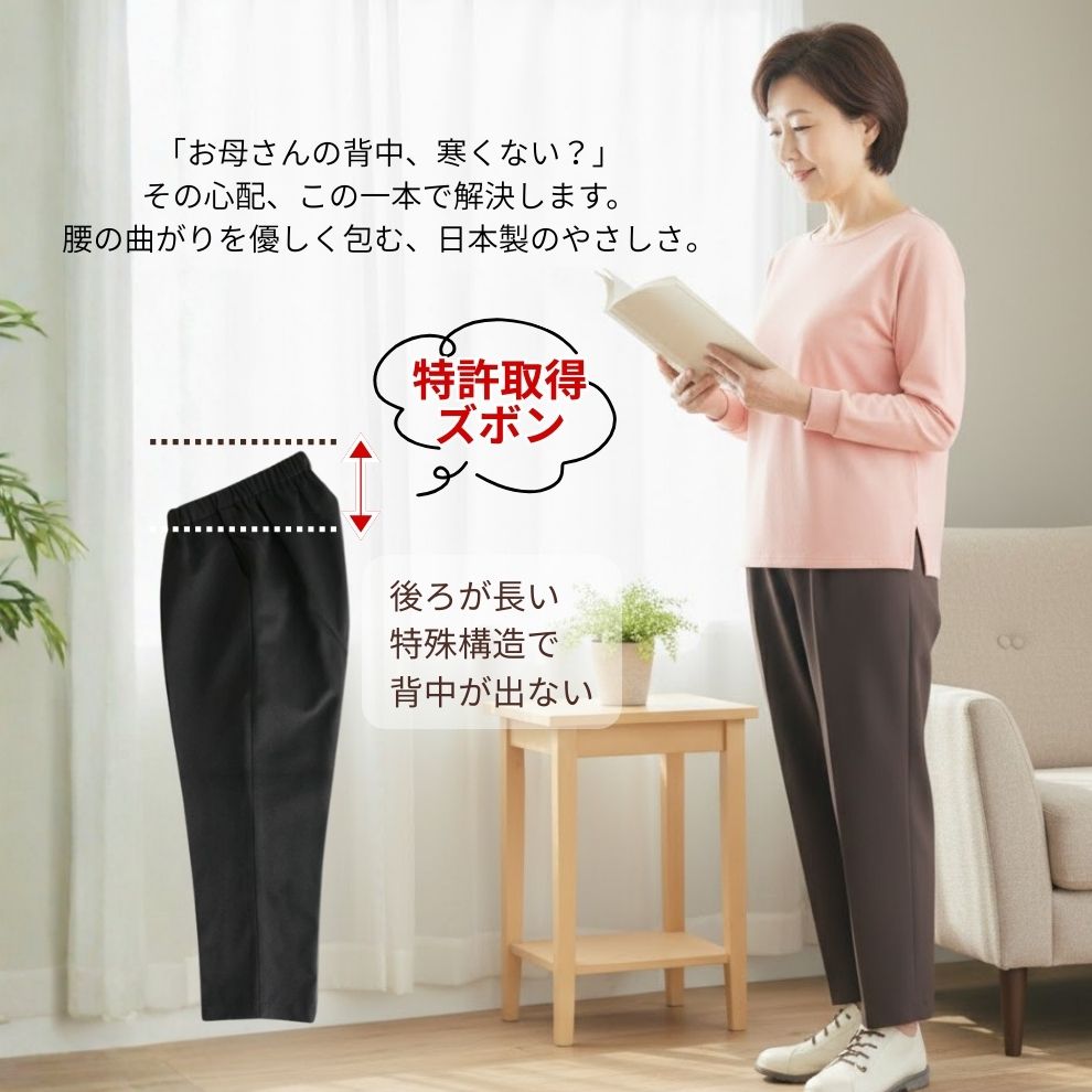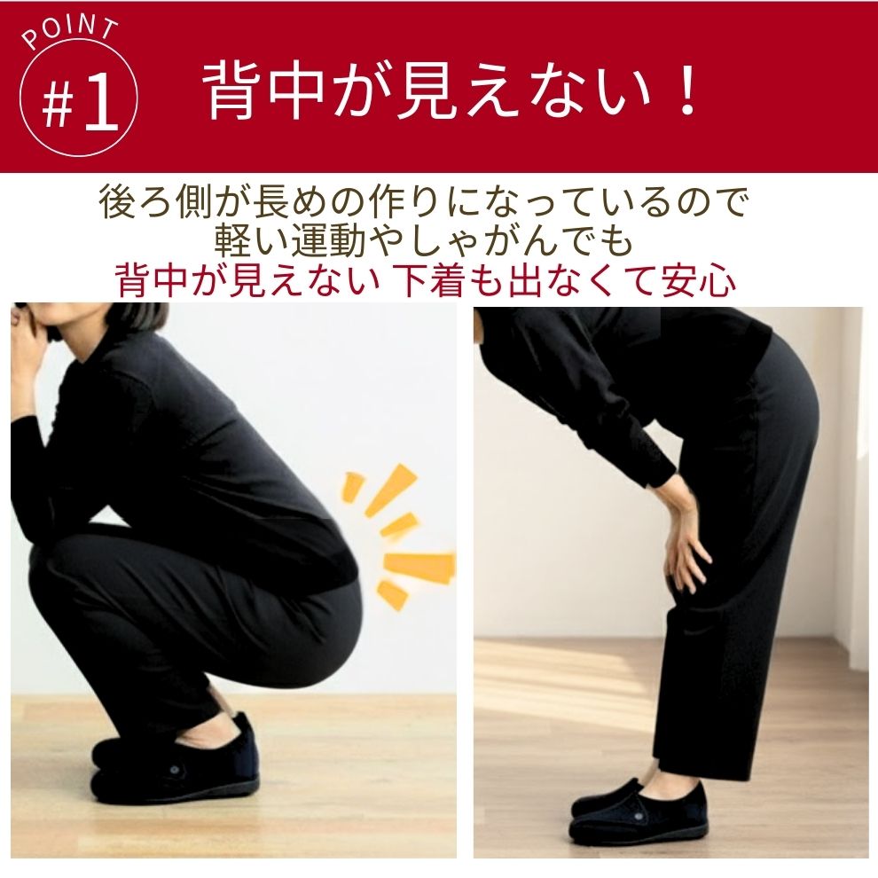 ■ ここが選ばれる3つの理由 1.特許取得の「背中が出ない」形 加齢による体型変化を研究し、後ろ股上を長く設計。