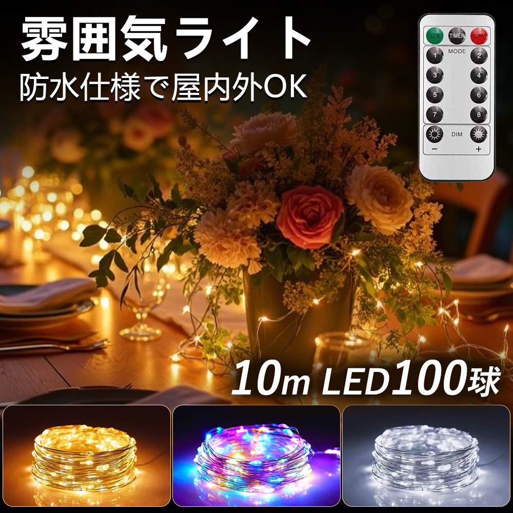 【商品仕様・365日間保証】<br>10メートル内容品:ライト(100LED)×1本(電池ケース付き)、リモコン、日本語使用説明書。<br>