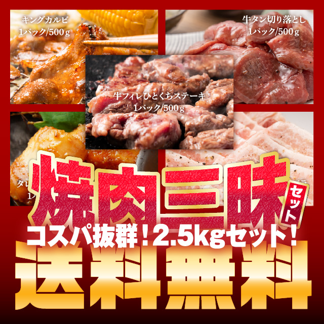| お届け内容 | ●牛フィレひとくちステーキ 500g ●キングカルビ 500g ●塩ダレ仕込み 牛タン切り落とし 500g ●焼肉用豚バラ肉 500g ●特製味噌漬 牛ホルモン 500g |