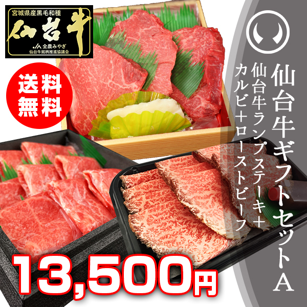 仙台牛ギフトセットA 仙台牛 最高級 A5ランク カルビ200g+ランプステーキ3枚+ローストビーフ200g 3点セット 豪華 贈答 贈り物 ギフト 御祝 内祝 御歳暮 お歳暮