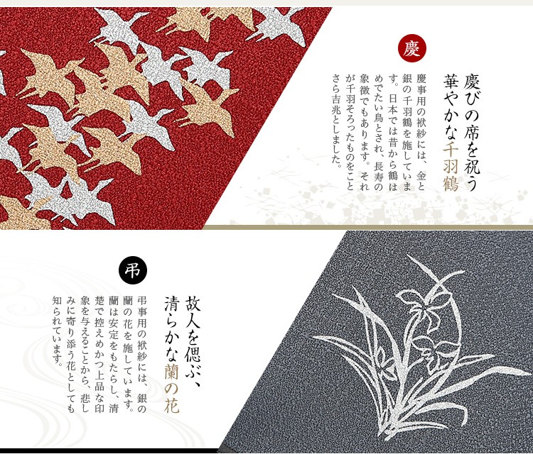 慶事には千羽鶴が施されたエンジ、弔事の際には清らかな蘭の花を施したグレーと使い分けていただくことができます。